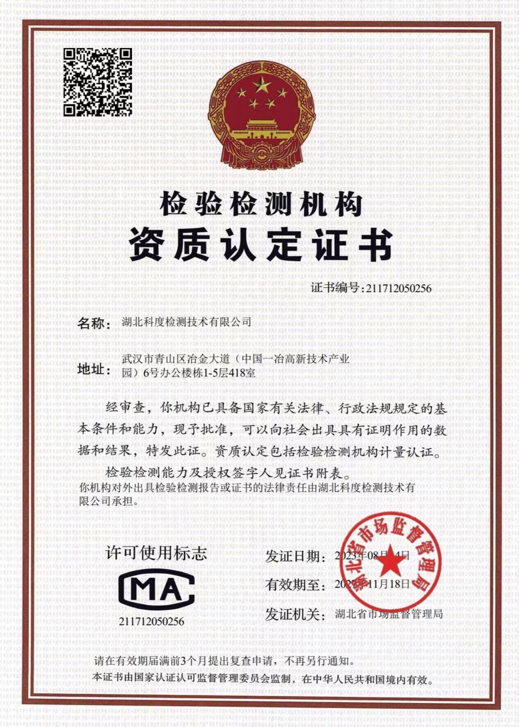 湖北科度檢測技術(shù)有限公司是一家專業(yè)從事環(huán)境類及相關(guān)領(lǐng)域檢測的第三方檢測機(jī)構(gòu),公司已通過湖北省市場監(jiān)督管理局CMA計量認(rèn)證,可以面向社會出具權(quán)威CMA檢測報告。 我公司實驗室嚴(yán)格按照國家標(biāo)準(zhǔn)建設(shè),擁有一大批國內(nèi)外先進(jìn)儀器設(shè)備及現(xiàn)代化配套設(shè)施,并有經(jīng)驗豐富的中高級專業(yè)技術(shù)人員和嚴(yán)格的實驗室質(zhì)量保證體系為項目運(yùn)作提供強(qiáng)力支撐。 作為第三方檢測機(jī)構(gòu),公司始終以高度的社會責(zé)任感經(jīng)營企業(yè),以“公正、嚴(yán)謹(jǐn)、高效”為宗旨,依托專業(yè)的技術(shù)實力為客戶提供專業(yè)優(yōu)質(zhì)檢測服務(wù),受到政府、企業(yè)和社會各界的廣泛關(guān)注和認(rèn)可。